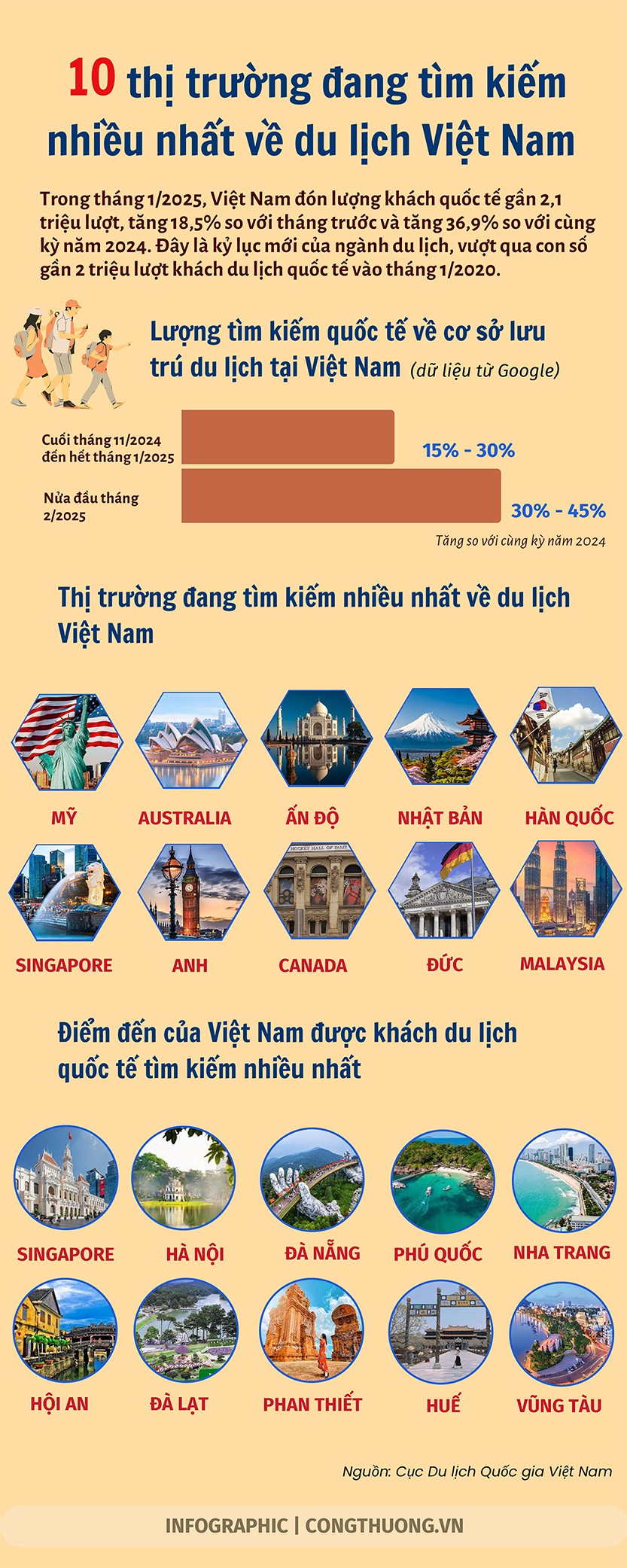 Theo Cục Du lịch Quốc gia Việt Nam, thống kê từ dữ liệu từ Google cho thấy, lượng tìm kiếm quốc tế về cơ sở lưu trú du lịch tại Việt Nam từ cuối tháng 11/2024 tới hết tháng 1/2025 tăng trong khoảng từ 15% - 30% so với cùng kỳ năm trước. Đáng chú ý, trong nửa đầu tháng 2/2025, lượng tìm kiếm quốc tế tiếp tục tăng ở mức 30% - 45%.