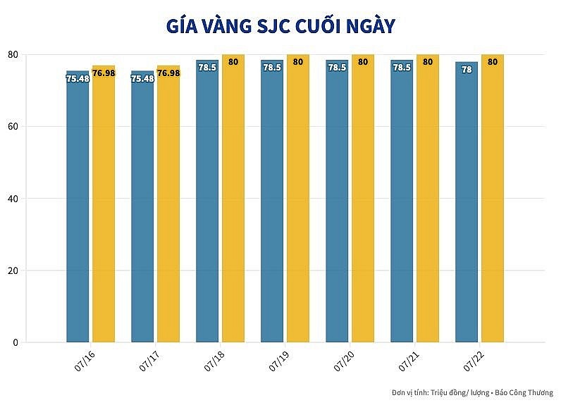 Vào thời điểm 5h sáng ngày 23/7/2024, giá vàng trên sàn giao dịch trong nước rơi xuống mức thấp nhất trong hơn một tuần. Cụ thể, giá vàng 9999 được DOJI được niêm yết ở mức 78,50 triệu đồng/lượng mua vào và 80,00 triệu đồng/lượng bán ra.
