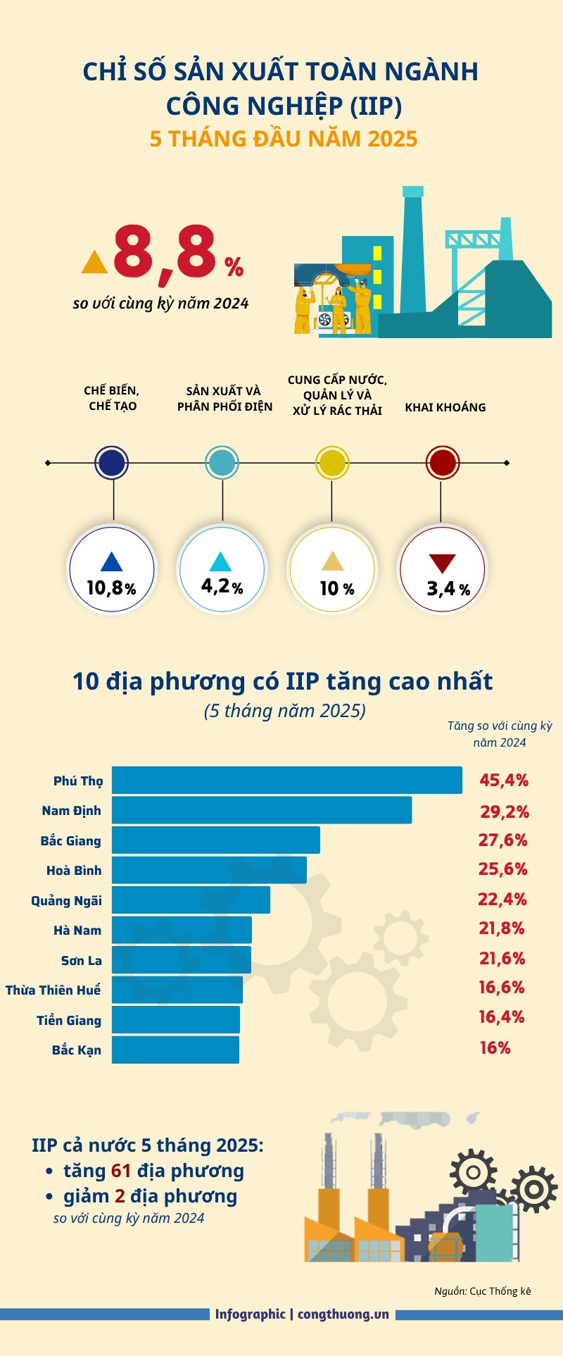 Tính chung 5 tháng đầu năm 2025, chỉ số sản xuất toàn ngành công nghiệp ước tính tăng 8,8% so với cùng kỳ năm 2024.