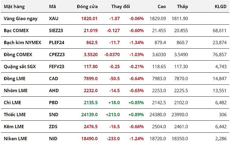 Đối với nhóm kim loại quý, giá bạch kim giảm mạnh nhất nhóm khi để mất 1,34% xuống 862,5 USD/oune, mức thấp nhất kể từ tháng 10/2022. Đây cũng là phiên giảm thứ tư liên tiếp của giá bạch kim. Trong khi đó, giá bạc giảm 5 phiên liên tiếp khi giảm 0,6% xuống 21,01 USD/ounce. Giá bạc tiếp tục duy trì ở vùng giá nhấp nhất trong vòng hơn 6 tháng. Đáng chú ý, giá vàng nối dài đà giảm sang phiên thứ chín liên tiếp khi giảm 0,06%, đóng cửa tại mức 1.820,01 USD/ounce.