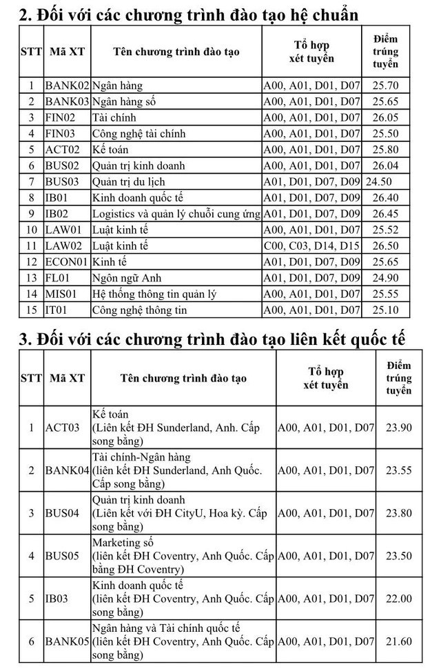 Tại Trường ĐH Kinh tế Tài chính TP.HCM, hai ngành có mức điểm cao nhất là kinh doanh quốc tế và quan hệ quốc tế (21 điểm). Các ngành Logistics và quản lý chuỗi cung ứng, truyền thông đa phương tiện, luật quốc tế có mức điểm trúng tuyển là 20. So với điểm sàn, điểm chuẩn tăng 1-3 điểm so với mức nhận hồ sơ tùy ngành. Thí sinh trúng tuyển theo các phương thức xét vào trường năm 2023 làm thủ tục nhập học từ 24-8 đến hết ngày 8-9.