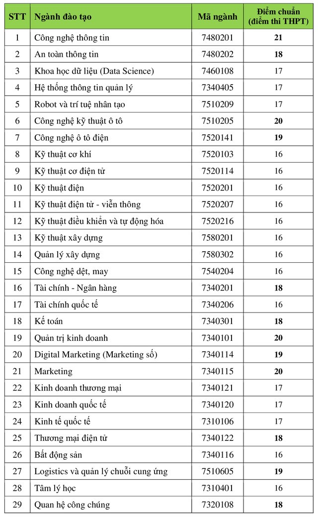 Tại Trường đại học Công nghệ TP.HCM, điểm chuẩn theo phương thức xét tuyển điểm thi tốt nghiệp THPT dao động 16-21 điểm tùy ngành. Cụ thể, các ngành công nghệ thông tin, được học có điểm chuẩn cao nhất là 21 điểm. Kế đó, các ngành công nghệ kỹ thuật ô tô, quản trị kinh doanh, marketing, truyền thông đa phương tiện có điểm chuẩn là 20 điểm.