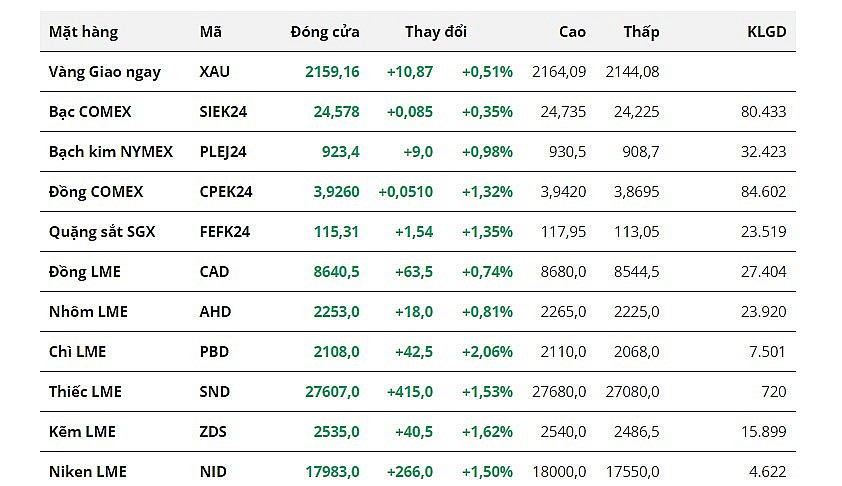 Đối với kim loại cơ bản, giá đồng COMEX bật tăng 1,32% lên 3,92 USD/pound, mức cao nhất kể từ cuối tháng 1. Đây cũng là phiên đánh dấu mức tăng mạnh nhất của giá đồng trong vòng 3 tuần trở lại đây. Giá quặng sắt cũng tăng 1,35% lên 115,31 USD/tấn.