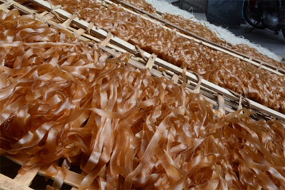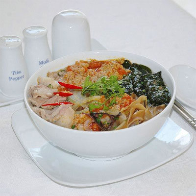 Linh hồn của món ăn là những sợi bánh đa màu nâu sậm, mỏng tang, mềm và dai, có vị giòn và đậm.