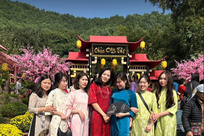 | Chị Nguyễn Thị Huế du xuân cùng những người bạn tại chùa Cây Thị. Ảnh: NVCC |