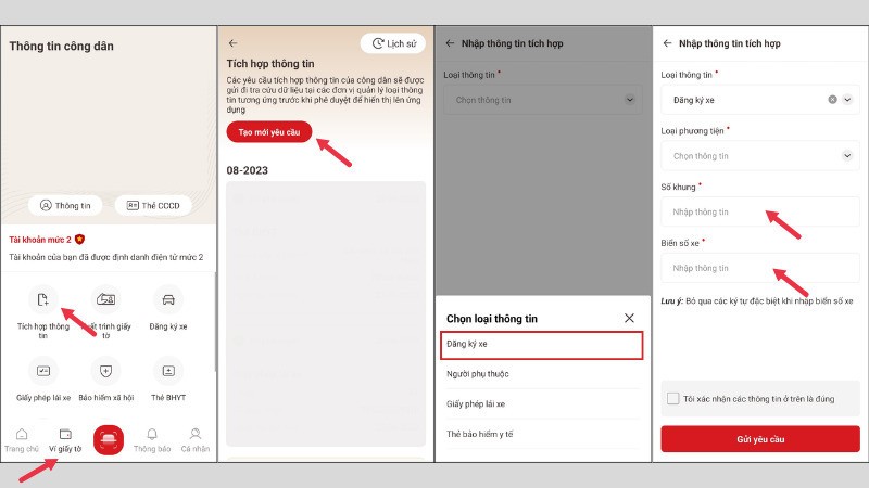 Đối với đăng ký xe: Cài đặt ứng dụng VNeID (nếu chưa cài) > Mở ứng dụng VNeID > vào mục Ví giấy tờ > chọn Tích hợp thông tin > nhấn vào Tạo mới yêu cầu > chọn Đăng ký xe > chọn Loại xe > nhập thông tin theo các mục yêu cầu > Gửi Yêu cầu và chờ xét duyệt.