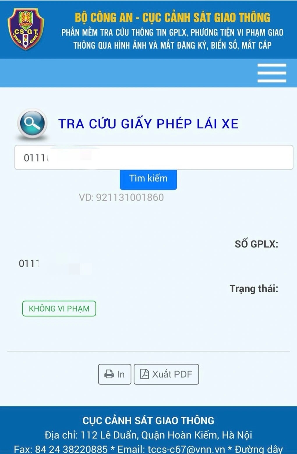 | Thông tin tra cứu trên phần mềm tra cứu thông tin GPLX của Bộ Công an. Ảnh: Công an cung cấp. |