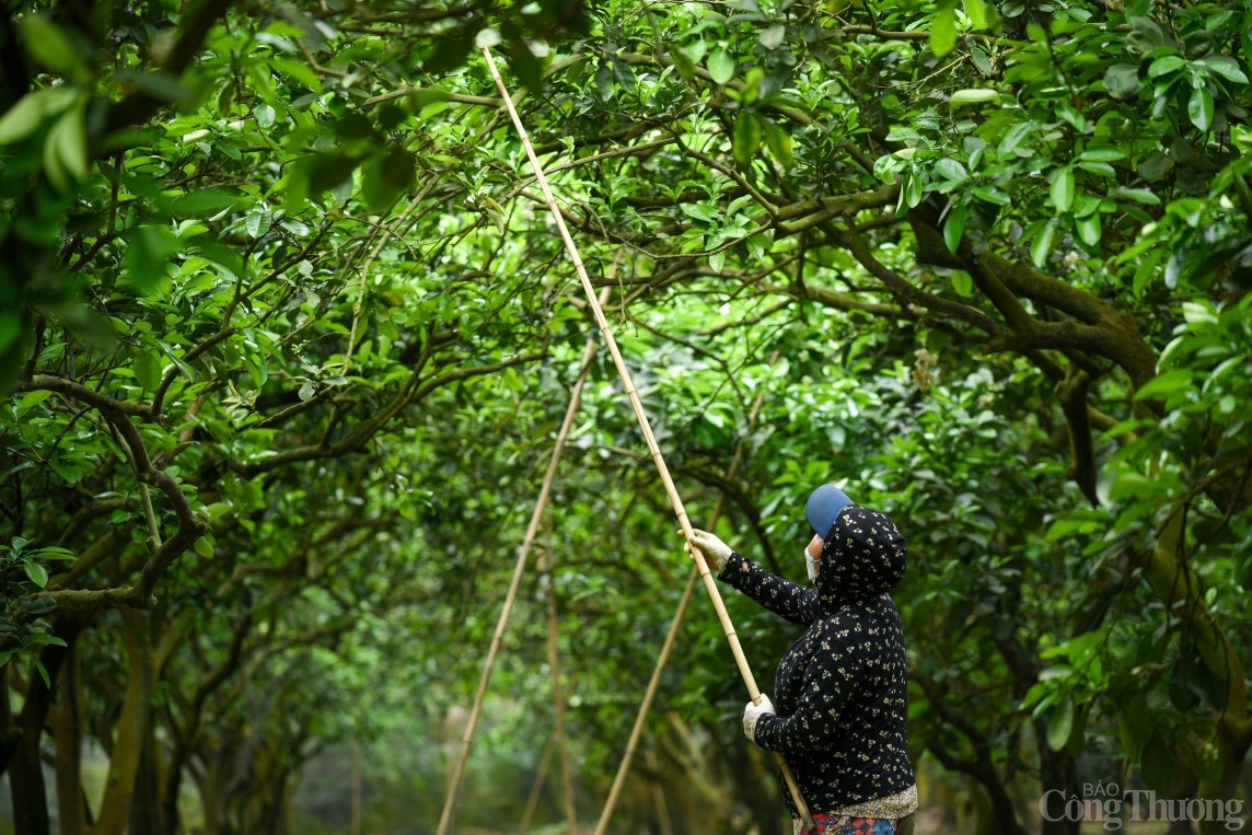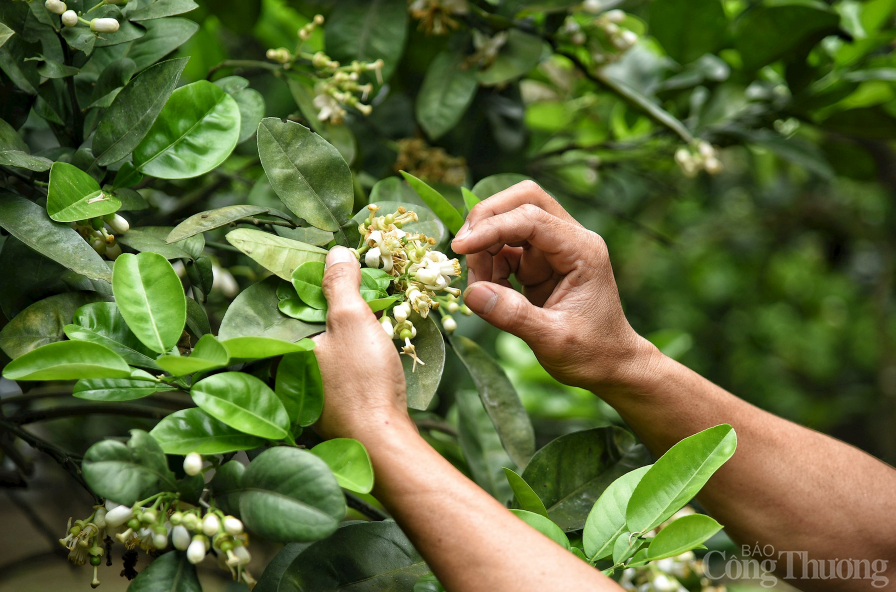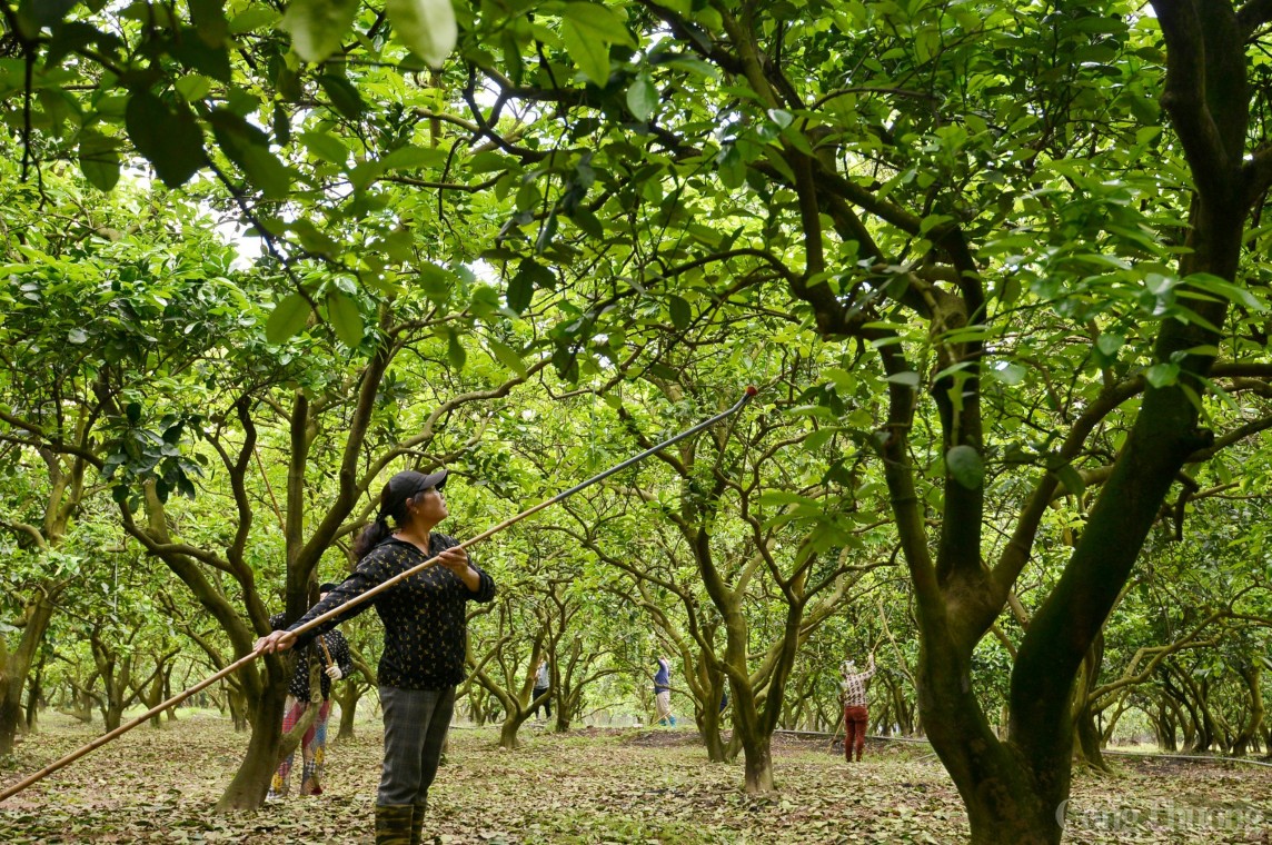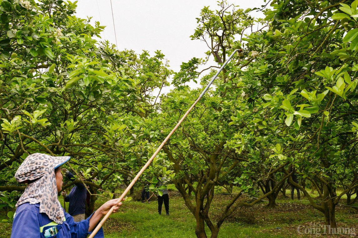 | Theo anh Nguyễn Gia Dũng, chủ nông trại bưởi Dũng Thu, do thời tiết năm nay lạnh hơn nên mãi đến tháng 3 cả ngàn cây bưởi mới bung nở hoa. Từ khoảng 5h sáng những ngày nắng nhẹ, nhân công được anh Dũng thuê lại đi hái hoa bưởi ở vườn, thụ phấn cho cây. |