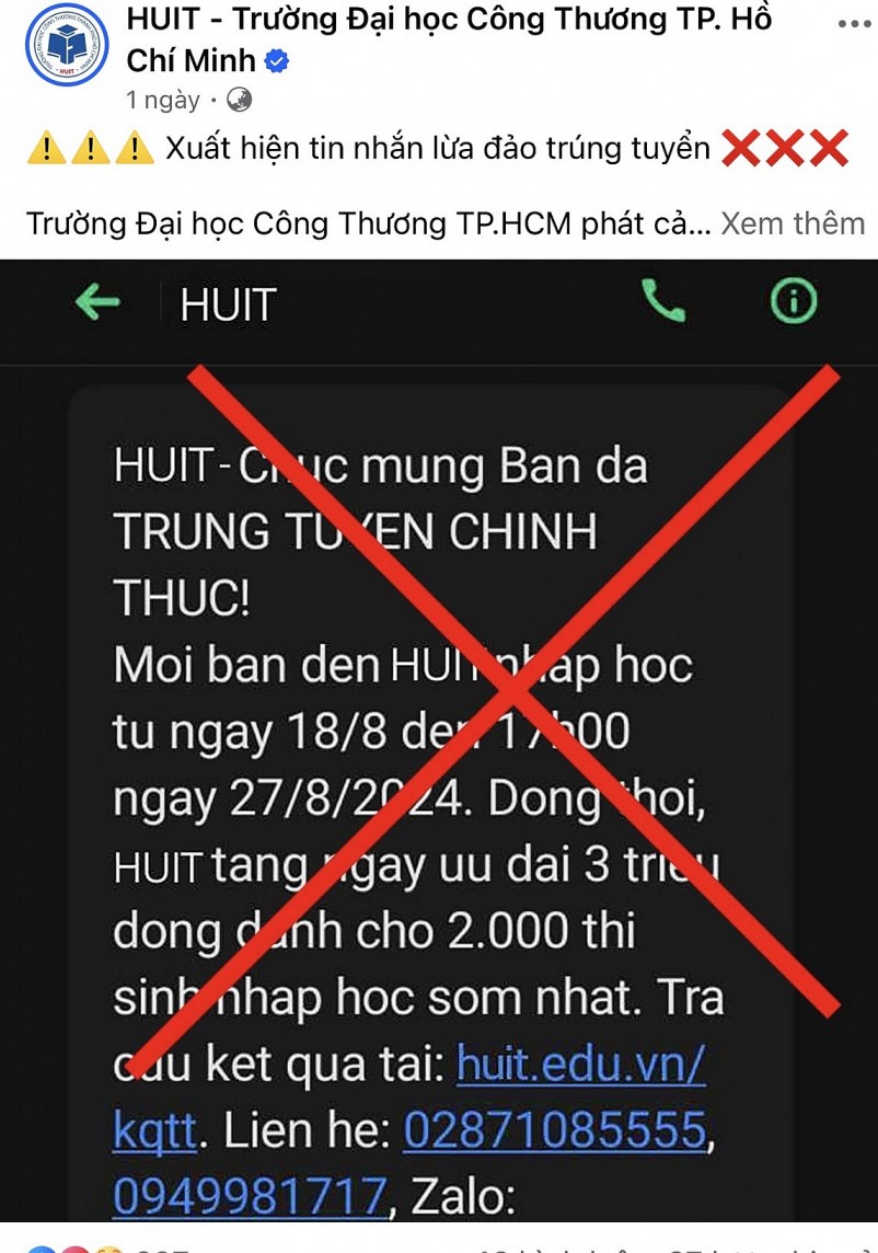 Mới đây, Trường Đại học Công Thương TP. Hồ Chí Minh đã phát cảnh báo gấp về việc một số thí sinh nhận được tin nhắn thông báo nhập học có tên được viết theo tên viết tắt của trường là HUIT.
