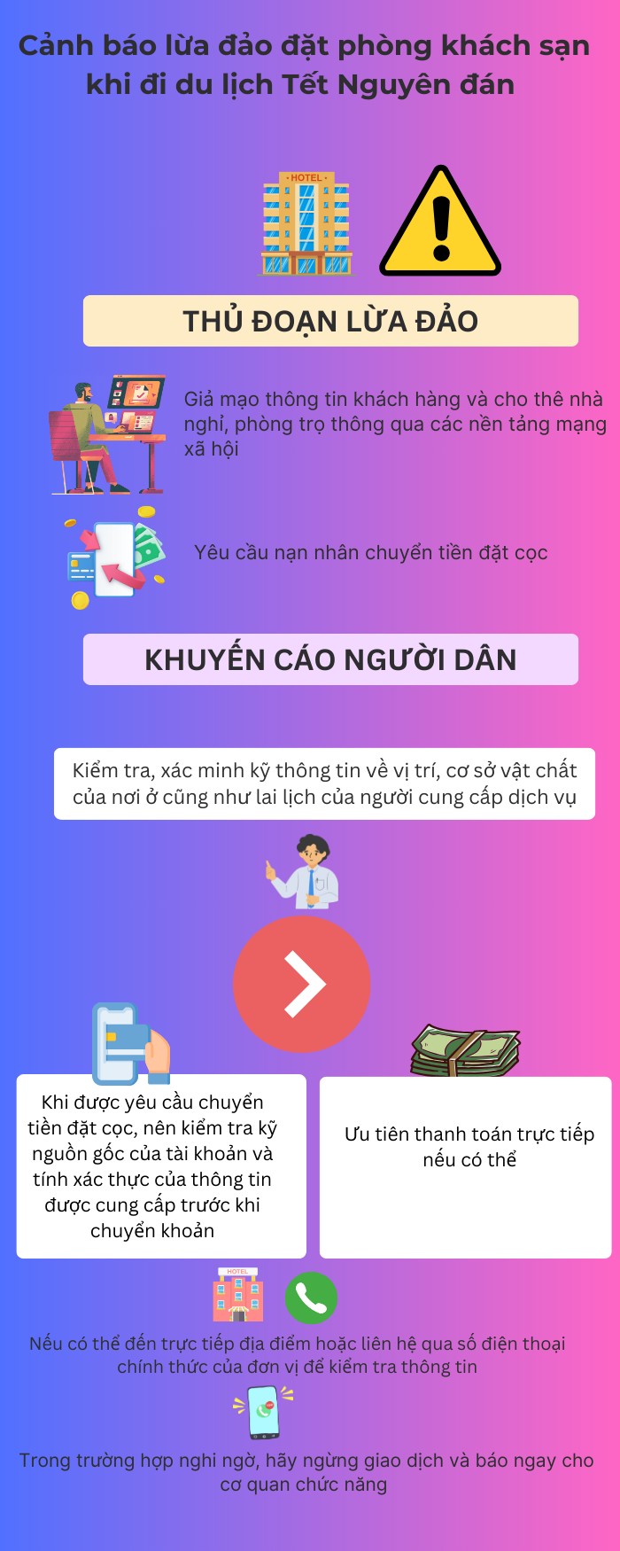 Dịp nghỉ Tết Nguyên đán dài ngày, người dân có xu hướng du xuân kết hợp với du lịch nghỉ dưỡng. Trong bối cảnh đó, các chiêu trò lừa đảo trực tuyến với thủ đoạn giả mạo thông tin khách sạn và cho thuê phòng trọ để lừa nạn nhân chuyển tiền đặt cọc cũng mọc lên như nấm. Người dân cần cẩn trọng khi đặt phòng khách sạn, phòng trọ, nhà nghỉ thông qua các nền tảng mạng xã hội.