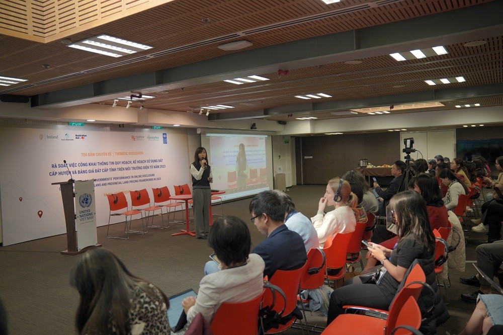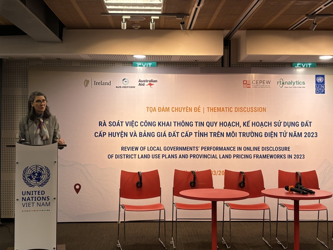 Phát biểu khai mạc tọa đàm, bà Ramla Khalidi, Đại diện thường trú, Chương trình Phát triển Liên Hợp Quốc (UNDP) tại Việt Nam cho biết: “Việc công khai minh bạch thông tin đất đai là rất quan trọng trong việc giảm thiểu rủi ro về khiếu nại và xung đột liên quan đến đất đai. Chúng tôi tin tưởng, đánh giá thường niên này sẽ cung cấp cho lãnh đạo chính quyền địa phương một công cụ để theo dõi việc thực thi luật pháp liên quan đến công khai thông tin đất đai cho người dân. Điều này đặc biệt quan trọng trong bối cảnh Luật Đất đai 2024 sẽ có hiệu lực từ tháng 1 năm sau”.