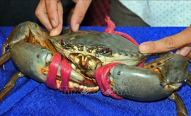 | Chỉ dẫn địa lý "Cua Cà Mau" không phải cấp cho tất cả các loại cua mà là giống cua xanh (tên khoa học là Scylla paramamosain) được khai thác tự nhiên hoặc sinh sản nhân tạo tại các trại sản xuất cua giống trong tỉnh Cà Mau. Ảnh: Huỳnh Anh/TTXVN |