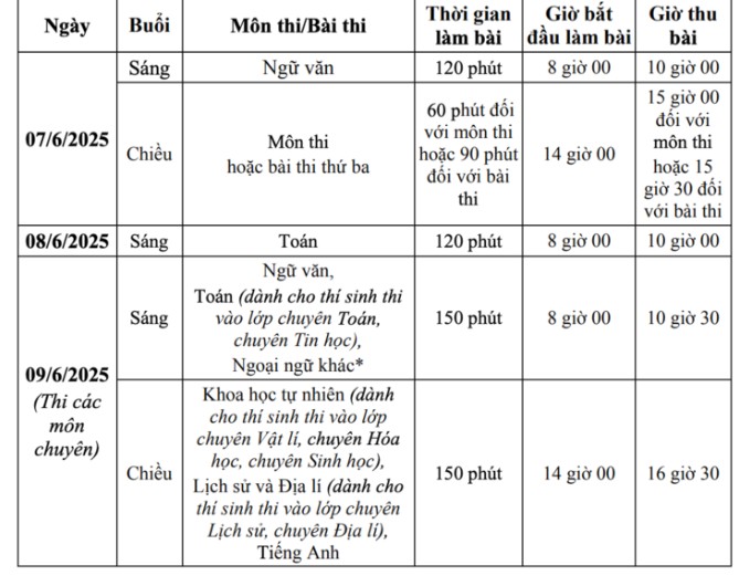 Cụ thể, thí sinh dự thi môn Ngữ văn vào sáng ngày 7/6 (120 phút), chiều cùng ngày thi môn Ngoại ngữ (60 phút), và sáng 8/6 thi môn Toán (120 phút). Môn Ngoại ngữ cho phép thí sinh lựa chọn một trong các thứ tiếng: Anh, Pháp, Đức, Nhật hoặc Hàn.