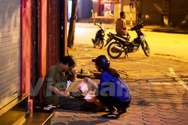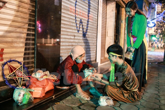 Những chị Hằng, chú Cuội đã trao những món quà nhỏ nhưng đầy ắp tình cảm đến cho những người không nhà cửa, lấy vỉa hè làm nhà. (Ảnh: Minh Sơn/Vietnam+)