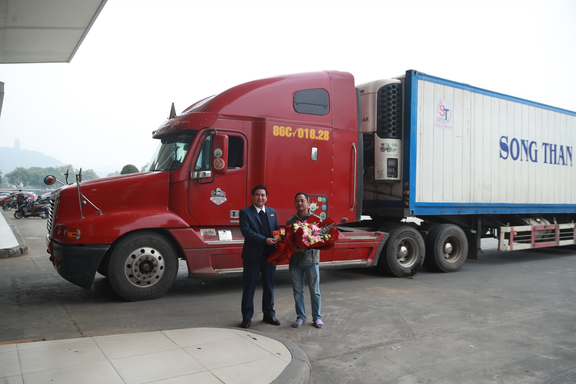 | Trưởng Ban Quản lý Khu Kinh tế tỉnh Lào Cai tặng hoa chúc mừng lái xe chở hàng xuất khẩu. |