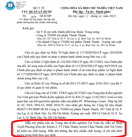 Ngày 20/3, Cục Quản lý Dược (Bộ Y tế) đã công bố Công văn số 2670/QLD-MP về việc đình chỉ lưu hành, thu hồi mỹ phẩm không đạt tiêu chuẩn chất lượng đối với Công ty TNHH Mỹ phẩm Thanh Thanh (địa chỉ tại 387 Tỉnh lộ 10, phường An Lạc A, quận Bình Tân, TP Hồ Chí Minh) - Chi nhánh Công ty TNHH Mỹ phẩm Thanh Thanh (xưởng sản xuất tại địa chỉ 389/16 Tỉnh lộ 10, phường An Lạc A, quận Bình Tân, TP Hồ Chí Minh).