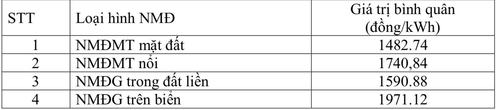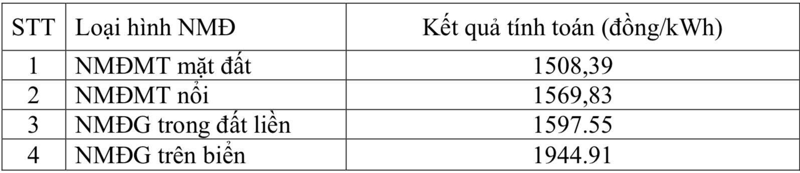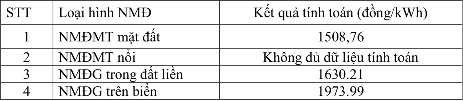 Phương án 2: EVN thực hiện tính toán cho 4 nhà máy điện tương ứng với 4 loại hình nhà máy điện mặt trời mặt đất, Nhà máy điện mặt trời nổi, nhà máy điện gió trong đất liền và nhà máy điện gió trên biển với thông số đầu vào tương tự phương án 1 trừ suất đầu tư tương ứng với từng loại hình được xác định bằng bình quân suất đầu tư tính toán của các nhà máy điện tương ứng.