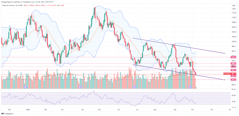 Về mặt kỹ thuật giá bạch kim, khung D1, giá bạch kim đã điều chỉnh giảm mạnh xuống vùng hỗ trợ 860 - 865 USD, đồng thời là đường trendline dưới của kênh giảm trung hạn. Phiên hôm trước đóng nến giảm, tuy nhiên có thể thấy nỗ lực của phe mua trong việc đẩy giá lên cao trước khi lực đẩy bị suy yếu về cuối phiên. Hơn nữa, thanh khoản giao dịch của 4 phiên gần đây đều có xu hướng giảm dần, cho thấy áp lực bán nhiều khả năng đã hạ nhiệt. Trong khi đó, trên khung 4H, RSI cũng đã cho tín hiệu phân kỳ dương. Tuy nhiên, nếu NFP tích cực, nhiều khả năng bạch kim có thể giảm sâu hơn nữa. Nhà đầu tư không nên mở vị thế tại thời điểm này.