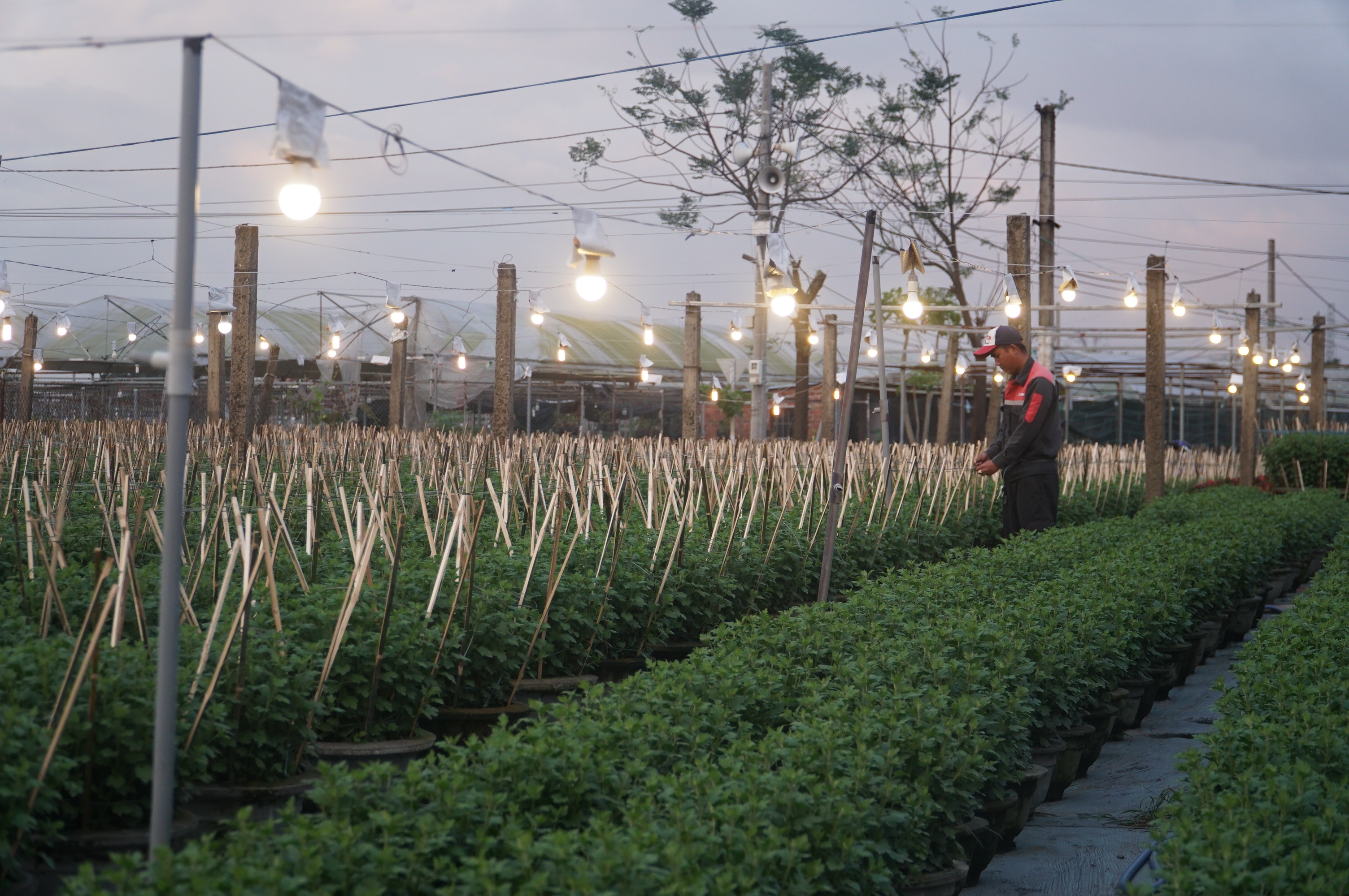 Anh Vĩnh cho biết, vào khoảng giữa tháng 8 âm lịch hàng năm, các hộ sẽ xuống giống hoa cúc cho dịp Tết. Qua khoảng đầu tháng 10 âm lịch sẽ chong đèn để cây hoa phát triển chiều cao, tránh đóng búp sớm, thời gian chong đèn khoảng 20 ngày. Giữa tháng 11 âm lịch sẽ ngắt nụ phụ để chăm nụ chính và đến giữa tháng 12 âm lịch sẽ xuất vườn phục vụ thị trường.