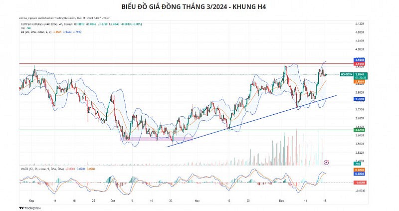 Về mặt kĩ thuật giá đồng, khung H4, giá biến động giằng co ở nửa trên của dải Bollinger Bands. Tuy nhiên chỉ báo đang cho thấy tín hiệu đảo chiều. MACD đang cắt đường Signal từ trên xuống với volume tăng dần, cho thấy tín hiệu bán đang hình thành. Nhiều khả năng giá sẽ giảm về 3,86 – 3,87 USD trong phiên hôm nay.