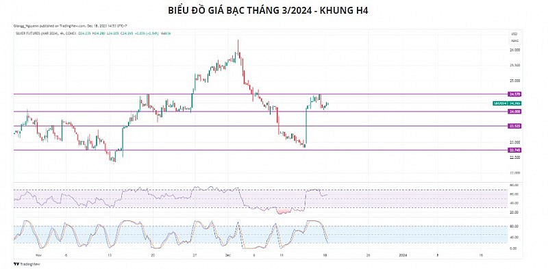 Về mặt kỹ thuật giá bạc, khung H4, giá biến động trong biên độ hẹp 24,2 - 24,3 USD. Phiên trước đóng nến inverted hammer, cho thấy lực mua suy yếu về cuối phiên. Dự báo bạc có thể giảm về 23,9 - 24 USD, trước khi tăng trở lại 24,5 - 24,6 USD.