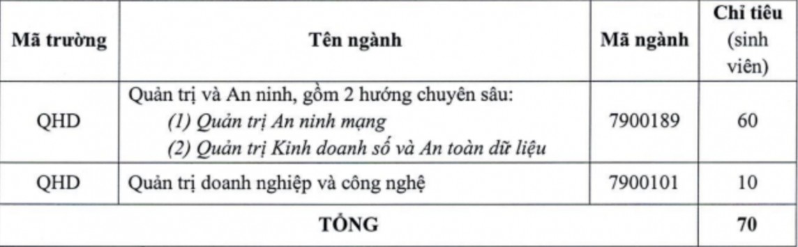 Trường Quản trị và Kinh doanh, Đại học Quốc gia Hà Nội tuyển bổ sung 70 sinh viên, trong đó 60 ở ngành Quản trị và An ninh; 10 sinh viên ở ngành Quản trị doanh nghiệp và công nghệ.