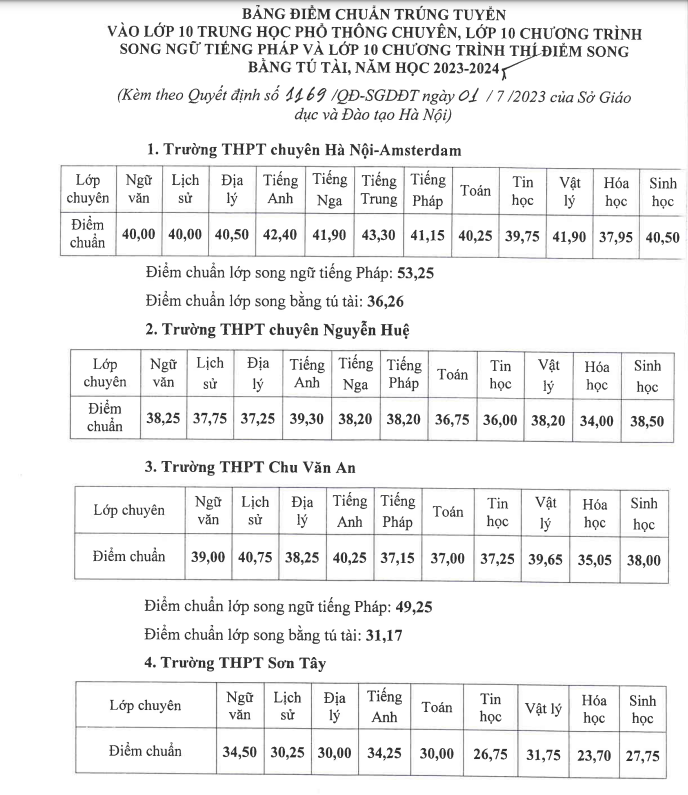 Sau khi có điểm chuẩn, trưa 1.7, Giám đốc Sở Giáo dục và Đào tạo Hà Nội đã ký quyết định duyệt điểm chuẩn và công bố điểm chuẩn vào các lớp chuyên. Điểm chuẩn vào lớp 10 các trường không chuyên sẽ được công bố trong chiều 1.7.