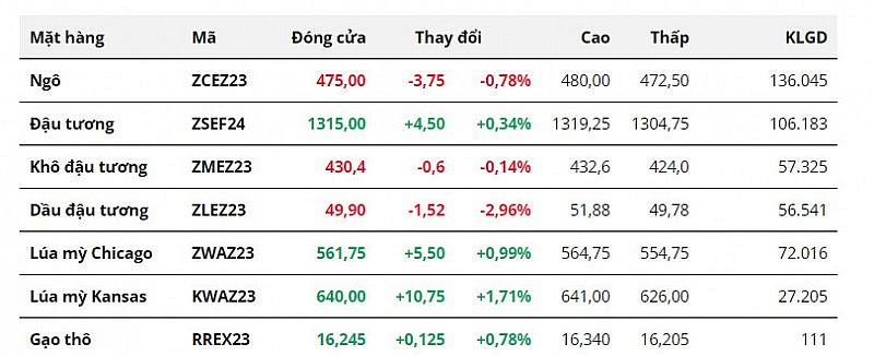 Mức đóng cửa lao dốc gần 3% đã đẩy giá xuống mức thấp nhất trong gần 5 tháng vừa qua. Áp lực từ triển vọng mùa vụ tích cực tại Argentina nhờ thời tiết thuận lợi vẫn là yếu tố đè nặng lên bảng giá dầu đậu và khô đậu tương. Trong khi đó, lực mua kĩ thuật đã giúp giá lúa mì hồi phục hơn 1% sau chuỗi ba phiên giảm giá liên tiếp.