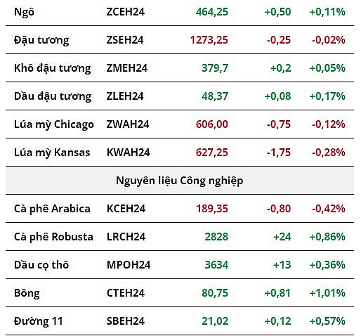 Thị trường nông sản diễn biến ảm đạm trước khi phiên tối mở cửa. Giá dầu đậu tương (ZLEH24 +0,17%) hiện vẫn duy trì sắc xanh trước triển vọng nhu cầu khả quan tại Mỹ. Cụ thể, trong báo cáo Ép dầu (Fats and Oils), USDA ghi nhận tồn kho dầu đậu tương đạt mức 1,59 tỷ pounds tính tới cuối tháng 11, thấp hơn mức kỳ vọng của thị trường và giảm 24.6% so với cùng kỳ năm ngoái, cho thấy nhu cầu tiêu thụ dầu đậu tương của Mỹ đang ở mức tích cực.