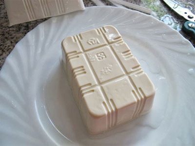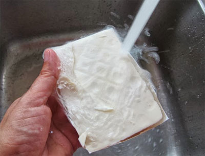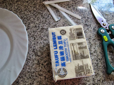 Bước 1: Lấy đậu ra khỏi hộp, bỏ hết chất lỏng thừa. Để lấy đậu phụ ra khỏi hộp mà không bị nát, bạn cắt các cạnh của hộp đậu, gỡ bỏ phần nắp nhựa bên trên. Sau đó sả nước vào các khe trống xung quanh hộp đậu, cho đến khi bạn cảm thấy miếng đậu nổi lên trên thì úp nó nuống và lấy được miếng đậu ra. Để miếng đậu lên đĩa là được.
