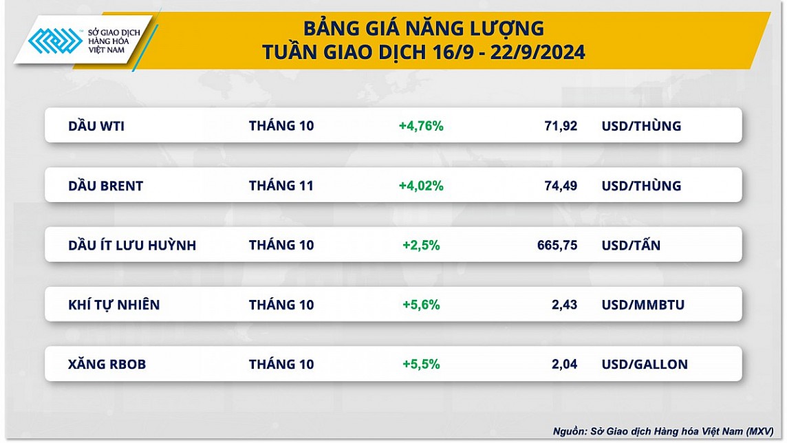 Thông tin từ Sở Giao dịch hàng hóa Việt Nam (MXV), giá dầu tăng liên tiếp sau khi Cục Dự trữ Liên bang Mỹ (FED) chính thức hạ lãi suất lần đầu tiên sau 4 năm thực hiện chính sách thắt chặt tiền tệ, bên cạnh đó nguồn cung sụt giảm từ Mỹ cũng đã thúc đẩy đà tăng trên thị trường.