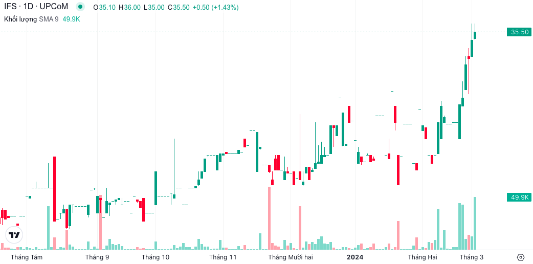 Trên thị trường, cổ phiếu IFS dạo gần đây liên tục tăng giá, hiện đứng ở vùng 35.000 đồng/cp, cao nhất kể từ khi lên sàn UPCoM và tăng hơn 16% từ đầu năm 2024 đến nay.