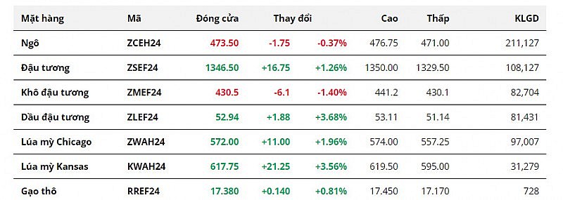 Giá đậu tương đóng cửa hồi phục 1,26%, qua đó chấm dứt chuỗi 3 phiên suy yếu liên tiếp. Báo cáo Daily Export Sales tối qua cho biết Mỹ đã bán được đơn hàng 123.300 tấn đậu tương niên vụ 2023/24 cho một nước giấu tên. Mặc dù, khối lượng đơn hàng không quá gây ấn tượng, nhưng thông tin trên phản ảnh nhu cầu quốc tế đối với mặt hàng này vẫn đang tương đối tốt, và tác động “bullish” đến giá.