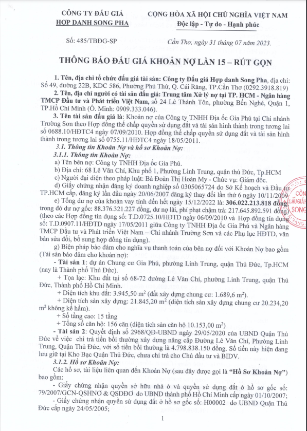 Ngày 31/7, Công ty Đấu giá hợp danh Song Pha tiếp tục thông báo đấu giá khoản nợ của Công ty TNHH Địa ốc Phú Gia tại Ngân hàng TMCP Đầu tư và Phát triển Việt Nam (BIDV) chi nhánh Trường Sơn, theo hợp đồng thế chấp quyền sử dụng đất và tài sản hình thành trong tương lai số 0688/HĐTC14 ngày 7/9/2010; hợp đồng thế chấp quyền sử dụng đất và tài sản hình thành trong tương lai số 0755.11/HĐTC14 ngày 18/5/2011.