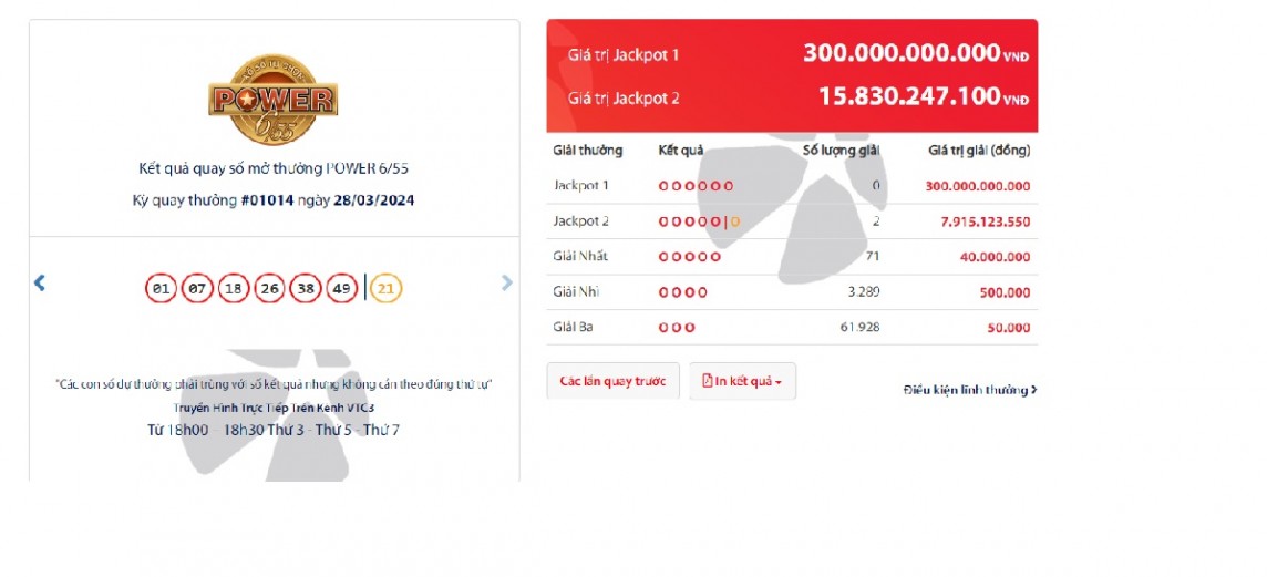 Theo tin từ Công ty Xổ số điện toán Việt Nam (Vietlott), kỳ quay số mở thưởng vào tối ngày 28/3 sản phẩm Power 6/55 có hai khách hàng trúng Jackpot 2. Mỗi giải trị giá 7.915.123.550 đồng.