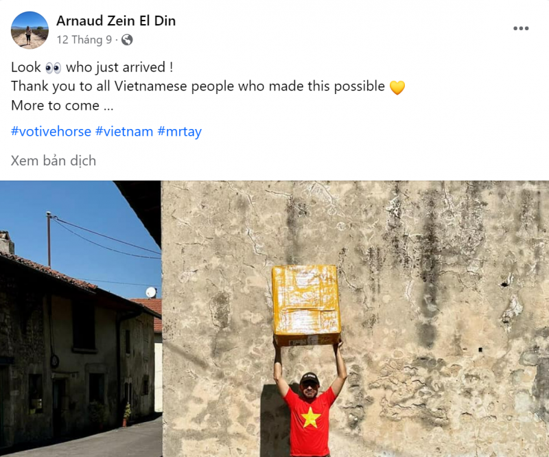 Tuy nhiên, sau khoảng 1 tháng chờ đợi, ngày 12/9, “ngựa vàng mã” đã được vận chuyển đến tận tay anh Arnaud Zein El Din. Chính kiến trúc sư, blogger 44 tuổi này đã chia sẻ trên trang cá nhân rằng “Nhìn xem, ai đã đến!” và không quên cảm ơn những người Việt Nam đã làm điều này dành tặng cho mình.