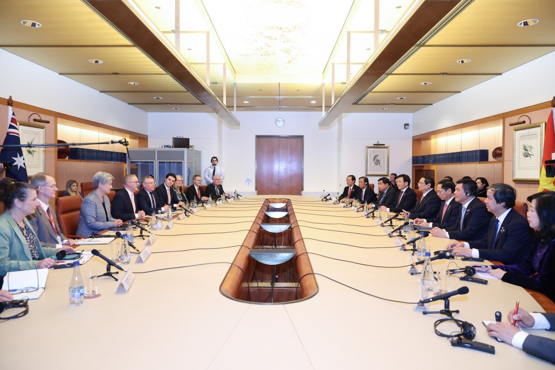 Sáng 7/3, sau lễ đón chính thức trọng thể tại Nhà Quốc hội, Thủ đô Canberra, với nghi thức cao nhất dành cho người đứng đầu Chính phủ, Thủ tướng Chính phủ Phạm Minh Chính đã có cuộc hội đàm sâu rộng với Thủ tướng Australia Anthony Albanese.