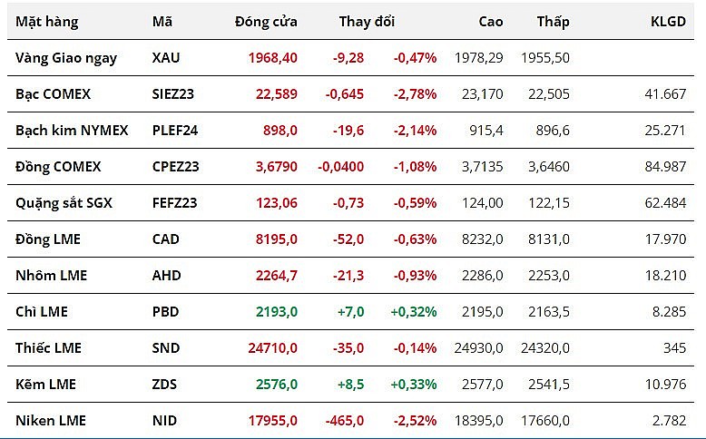 Đối với nhóm kim loại quý, giá cả ba mặt hàng giảm phiên thứ hai liên tiếp. Giá bạc giảm mạnh nhất nhóm khi để mất 2,78%, dừng chân ở mức 22,58 USD/ounce. Đây cũng là phiên giảm giá mạnh nhất của giá bạc kể từ đầu tháng 10. Giá bạch kim để mất mốc 900 USD/ounce, đóng cửa tại mức 898 USD/ounce sau khi giảm 2,14%. Giá vàng cũng suy yếu 0,47% xuống 1.968,4 USD/ounce.
