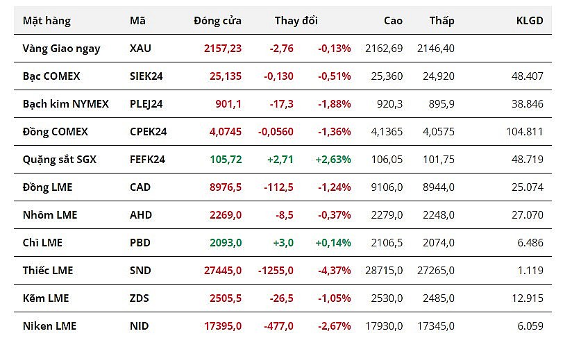Đối với nhóm kim loại cơ bản, diễn biến có phần trái chiều hơn, nhưng sắc đỏ vẫn chiếm ưu thế. Đồng COMEX chốt phiên giảm 1,36% giá trị xuống 4,07 USD/pound. Bên cạnh áp lực từ đồng USD, những dữ liệu phán ánh thị trường bất động sản yếu kém của Trung Quốc đã tạo áp lực lên giá đồng.