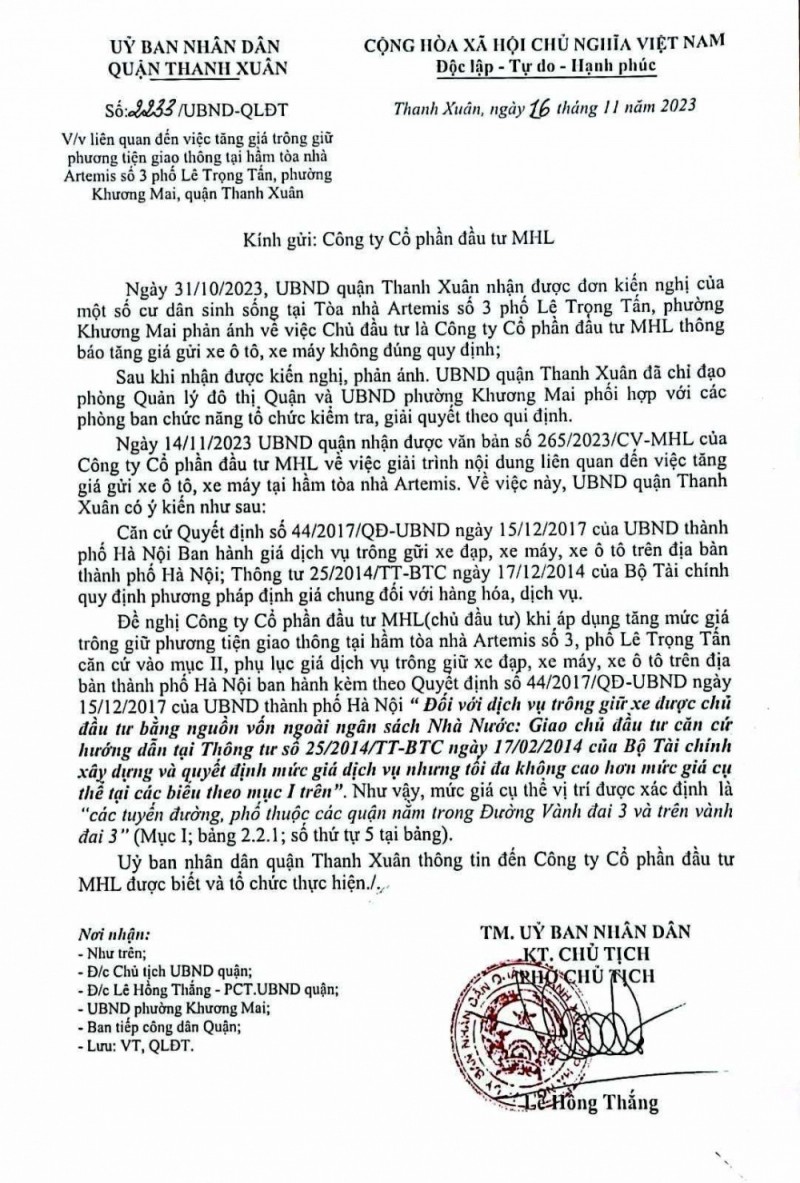 Đặc biệt, phát biểu trong cuộc họp, đại diện chủ đầu tư cũng bày tỏ sự bức xúc về văn bản chỉ đạo số 2233/UBND-QLĐT của UBND quận Thanh Xuân ký ngày 16/11/2023 liên quan đến việc tăng giá trông giữ xe đang gây nhiều tranh cãi này.