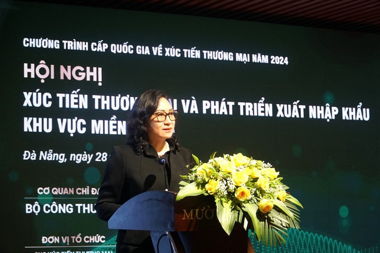 | Thứ trưởng Bộ Công Thương Phan Thị Thắng phát biểu tại Hội nghị Xúc tiến thương mại và phát triển xuất nhập khẩu khu vực miền Trung. Ảnh: Vũ Lê |