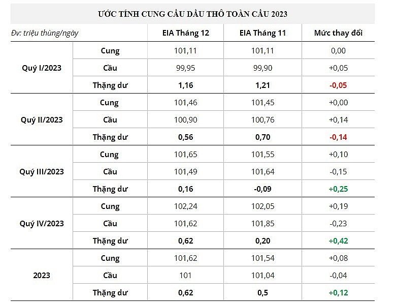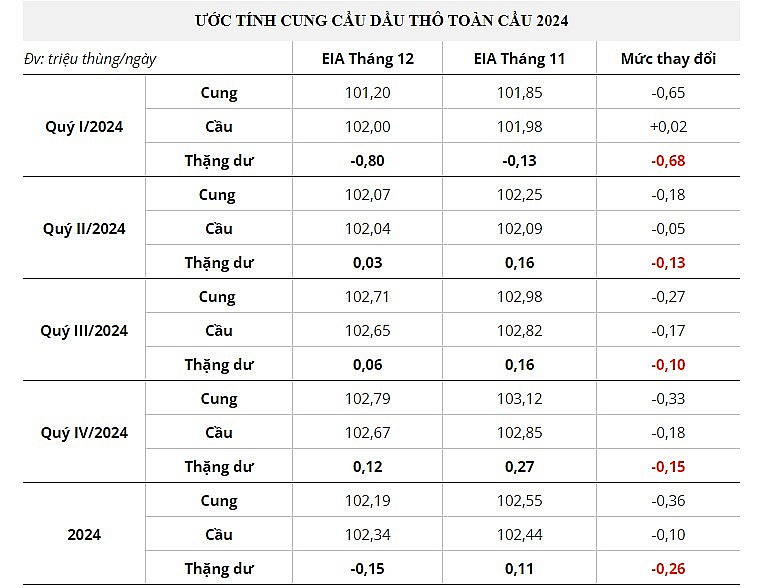 Đối với năm 2024, sau khi OPEC+ tuyên bố kéo dài chính sách cắt giảm tự nguyện, EIA dự báo thị trường sẽ chuyển trở lại trạng thái thâm hụt trong quý 1 và sẽ dần trở lại trạng thái cân bằng trong các quý còn lại.