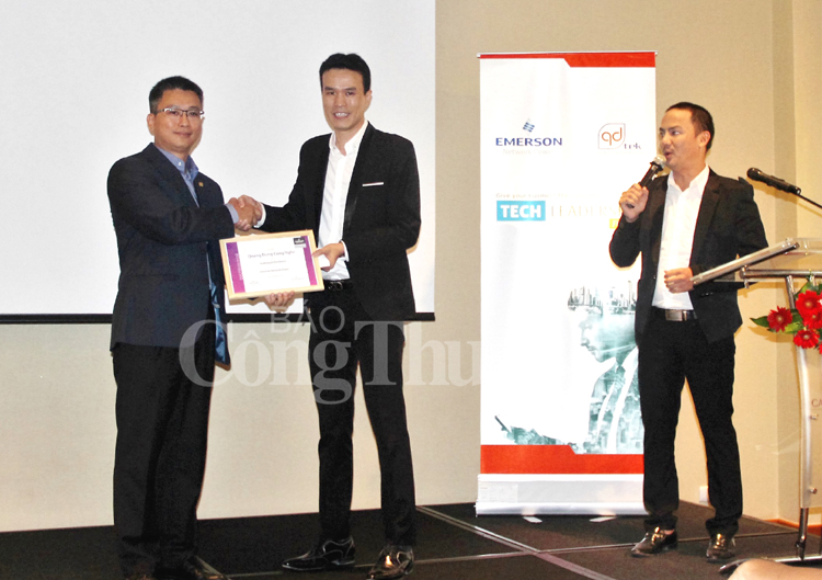 | Ông Đặng Thành Quân - Tổng Giám đốc QD.Tek (trái) - nhận giấy giấy ủy quyền phân phối giải pháp của Emerson |
