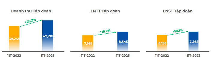 Về khối giáo dục, đầu tư, khác, doanh thu 11 tháng đầu năm đạt 4.842 tỷ đồng, tăng 53% so với cùng kỳ năm ngoái. Lãi trước thuế đạt 1.735 tỷ đồng, tăng trưởng 31%.
