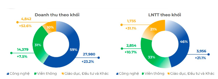 Về cơ cấu hoạt động của FPT, trong 11 tháng đầu năm qua, khối công nghệ (bao gồm dịch vụ công nghệ thông tin trong nước và dịch vụ công nghệ thông tin nước ngoài) tiếp tục giữ vai trò chủ chốt, đóng góp 59% doanh thu và 46% lợi nhuận trước thuế toàn tập đoàn.