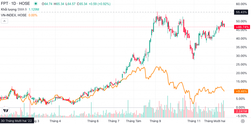 Trên thị trường, cổ phiếu FPT đang giao dịch trong vùng 96.000 đồng/cp, cao hơn 45% so với hồi đầu năm. Trong khi đó, chỉ số VN-Index cùng khung thời gian tăng khoảng 9,4% từ 1.007 điểm lên 1.102 điểm, thấp hơn đáng kể so với FPT.