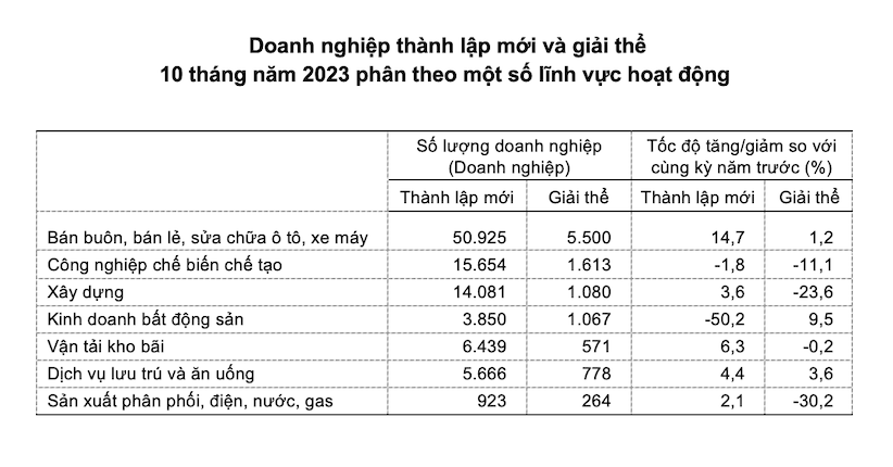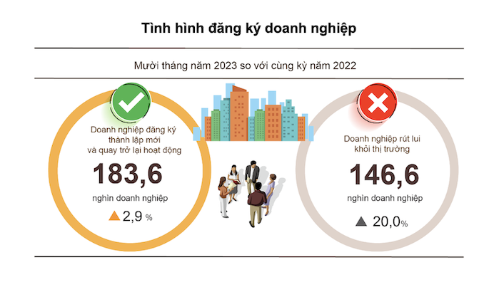Tính chung 10 tháng năm 2023, số doanh nghiệp tạm ngừng kinh doanh có thời hạn là 81 nghìn doanh nghiệp, tăng 22,1% so với cùng kỳ năm trước. 50,7 nghìn doanh nghiệp ngừng hoạt động chờ làm thủ tục giải thể, tăng 25,9%. 14,7 nghìn doanh nghiệp hoàn tất thủ tục giải thể, giảm 4,5%. Bình quân một tháng có 14,7 nghìn doanh nghiệp rút lui khỏi thị trường.