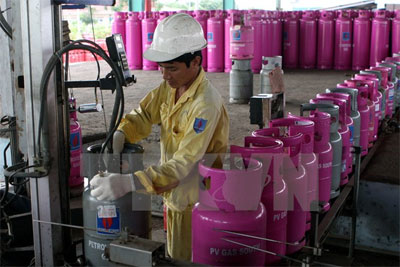 Chiết nạp bình gas ở Công ty Khí hóa lỏng miền Nam - Tổng kho Cần Thơ. (Ảnh: Hà Thái/TTXVN)