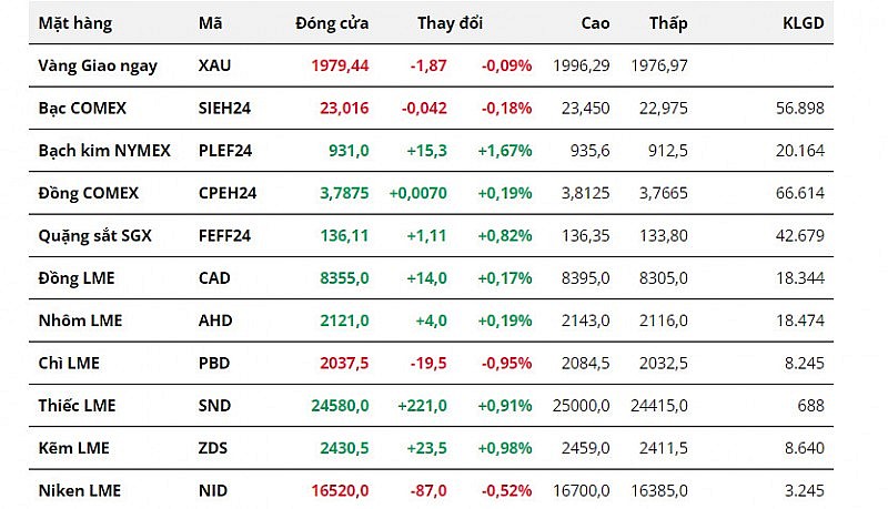 Đối với kim loại cơ bản, giá đồng COMEX phục hồi 0,19%, chốt phiên tại 3,78 USD/pound. Thị trường đồng đón nhận lực mua tích cực trong phiên sáng do rủi ro nguồn cung thu hẹp. Công ty Macquarie đã hạ dự báo thặng dư thị trường đồng xuống 100.000 tấn trong năm 2024 và 287.000 tấn năm vào năm 2025, giảm lần lượt từ mức 203.000 tấn và 369.000 tấn trong dự báo trước. Ở chiều ngược lại, giá quặng sắt phục hồi 0,82% lên 136,11 USD/tấn.