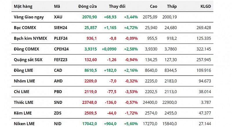 Kết thúc tuần giao dịch 27/11 – 3/12, thị trường kim loại ghi nhận diễn biến phân hóa. Đối với nhóm kim loại quý, giá bạc nối dài đà tăng sang tuần thứ ba liên tiếp khi tăng 4,72% lên 26,86 USD/ounce, mức cao nhất trong 6 tháng. Giá vàng cũng bật tăng lên mức cao nhất mọi thời đại, neo tại mức 2.070,9 USD/ounce nhờ tăng 3,44%.